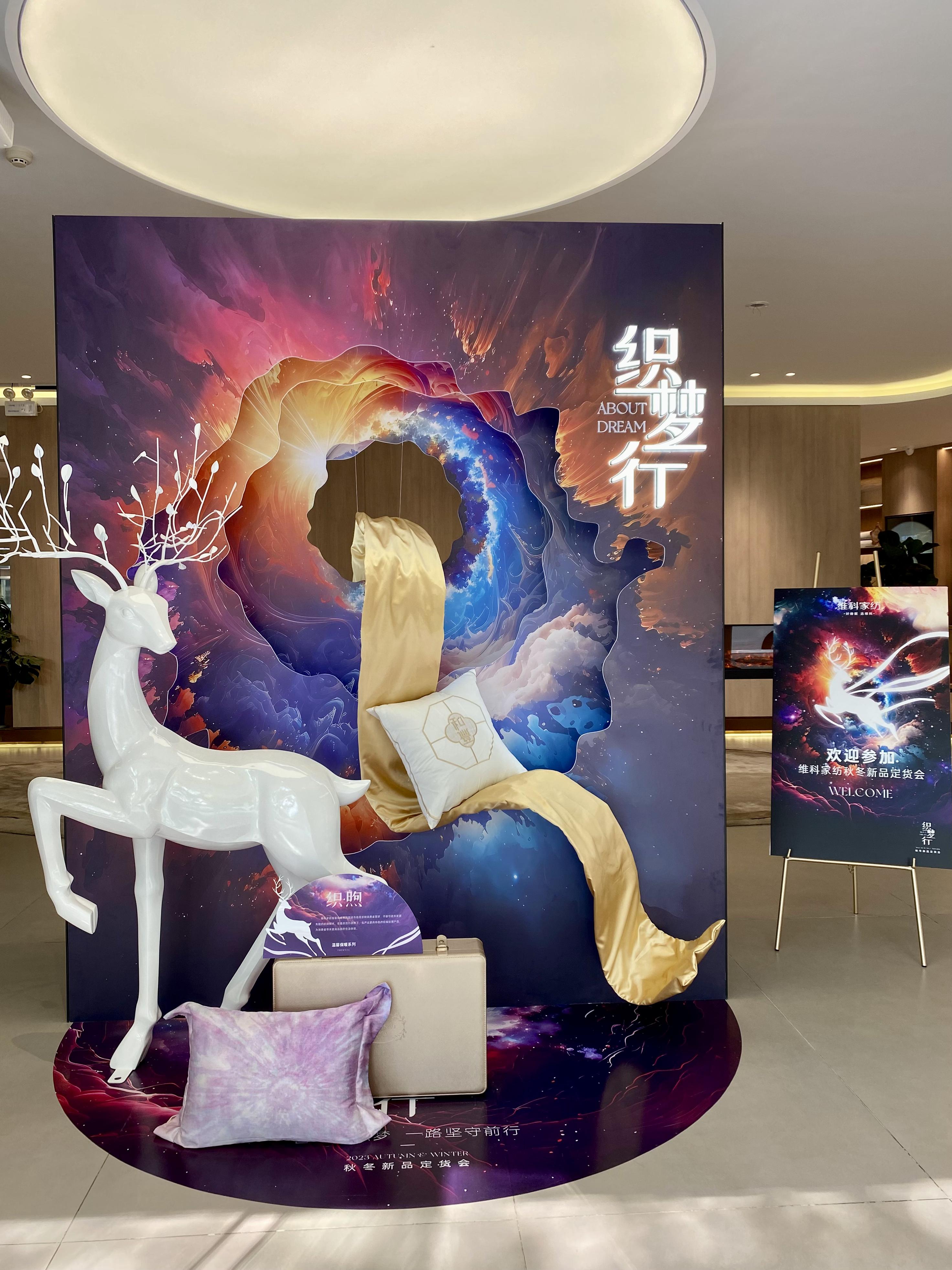 作為定貨場(chǎng)地的維科家紡總店,其陳列布置秉承“織夢(mèng)行”主題,將夢(mèng)幻元素與現(xiàn)代風(fēng)格相融合,打造出一系列充滿想象力和溫暖的場(chǎng)地。
